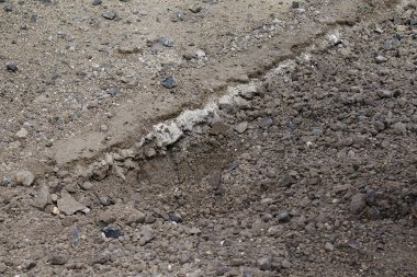 Jól látszik a régi útszerkezet – fent az egykor aszfaltnak nevezett réteg. Az új részen homogén, laza a felső réteg – a tömörítás még hátravan