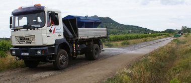 Végső menet a stabilizálás – kálcium-kloriddal szórják be az utat, ami egyben pormentesít is