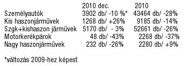 2010-ben Magyarországon 43 464 darab új személygépkocsit értékesítettek, ez 28 százalékos csökkenés a 2009-es évhez képest. A 3,5 tonna alatti haszonjárművekből 9185 darabot értékesítettek, ez 14 százalékos csökkenés, itt a nagyon erős utolsó negyedév miatt lett kisebb a bukta. Ez egyébként arra utal, hogy a vállalkozások elkezdtek autókat vásárolni, mert eddig tudták gazdaságosan meghosszabbítani a munkaeszközök élettartamát, mostmár annyit futottak a teherautók, hogy a megnövekedő karbantartási költségek miatt célszerű új járművet vásárolni. Egyébként szinte kizárólag csak flottaértékesítések történnek e szegmensben, azaz csak a nagy cégek cserélik le járműveiket, a kis és közepes vállalkozások még kivárnak.