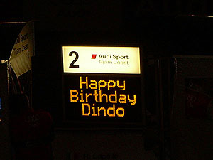Éjfél után így gratuláltak a csapattársak Idén több, mint 260 ezer néző figyelte a történelem egyik legizgalmasabb 24 órás Le Mans-i versenyét. A váltakozó időjárási körülmények a futam kezdetén megpecsételték a hármas rajtszámmal induló Audi R10 TDI sorsát, a harmadik körben Mike Rockenfeller letért az eső áztatta pályáról, és a védőkorlátnak ütközött. A Dindo Capello, Allan McNish és a Le Mans rekordgyőztes Tom Kristensen alkotta csapat versenye is idő előtt ért véget: miután 16 órán keresztül vezették a versenyt, vasárnap reggel leszakadt az Audi R10 TDI bal hátsó kereke. Dindo Capellonak, – aki a 43. születésnapját ünnepelte vasárnap -, nem volt esélye elkerülni a balesetet.