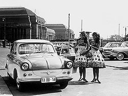 A Trabant története valójában 1949-ig nyúlik vissza, amikor a DKW (Das Kleine Wunder – A kis csoda) gyár elkezdte az IFA F8 fedőnevű családi mini gyártását. Kétütemű motorja és küldetése révén tulajdonképpen ez a modell tekinthető a Trabi ősének, mégsem ez a hivatalos álláspont, hiszen az acélvázon nyugvó, Duroplast műanyagból (lásd keretes írásunkat) készített Trabant P50-es csak 1957-ben mutatkozott be. A pártutasításra kifejlesztett zwickaui népautó 500 cm3-es, négyfokozatú aszinkron sebességváltóval társított, 18 lóerős aggregátja nem tartozott a legfejlettebb erőművek közé, így a 620 kilogrammos tömeg ellenére visszafogott gyorsulás és 90 km/óra körüli végsebesség jellemezte az autót. Ennek ellenére a keresztlaprugókra támaszkodó Trabant azonnal közönségkedvenccé vált, s annyian rendelték, hogy még jó harminc évvel a forgalmazás kezdete után sem sikerült magát “behoznia” a gyártásnak.