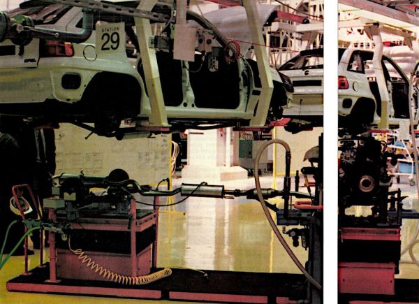 Egy héttel az ünnepélyes gyáravató előtt az utolsó simítások fedőnéven közismert sürgés-forgás volt tapasztalható az üzemcsarnok környékén, bent, a két irdatlan (150 x 180 méteres) teremben azonban ennek semmi nyomát nem láttuk. Ami a motorszerelő-csarnokot illeti, ez érthető, hiszen ott csak július elsején kezdődik a termelés, eleinte egy műszakban. A teljes kapacitás évi kétszázezer motor, háromműszakos munkával. A tervek szerint az 1,6 literes kivitelt gyártják az első időben, s csak később bővül a termékskála az 1,4 literes változattal. Itt pillanatnyilag nem sok a látnivaló, a fémmegmunkáló gépek beállítása nem tartozik a nagy nézettségi indexű tevékenységek közé.