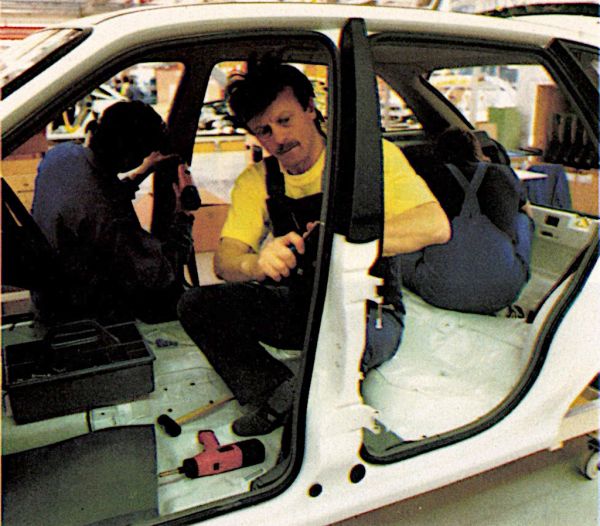Amikor a karosszéria kikerül a fényezőüzemből, leszerelik az ajtókat és egy külön munkahelyen építik be az üvegeket, helyezik fel a zárat és a kárpitot. Természetesen minden ajtó a „saját” kocsijára kerül vissza, erről az azonosítólapok gondoskodnak. Ez azonban a szalag végén történik, s addig még jó pár fontos tennivaló hátravan. Egyebek között a motor és a futóművek beépítése. Ezeket az elemeket előbb egy sablonon összerakják, s amikor már minden, beleértve a kipufogórendszert is, a helyére került, a magasban kígyózó sínekről alácsüngő karokon lebegő karosszériához emelik. Minthogy a folyamatos gyártás ottjártunkkor még nem valósult meg, szerencsésnek nevezhettük magunkat, mert láttuk, amint egy kész autó lekerült a gyártószalagról. Az ott dolgozó munkás beült – ez egyszerű művelet, mert ajtók még nincsenek a karosszérián –, elfordította az indítókulcsot, s az indítómotor néhány másodpercnyi működése után a motor beindult. Hamarosan odatolták a megfelelő ajtókat tartalmazó szállítókeretet, felszerelték a négy ajtót, s ezzel elkészült a 013-as Astra.