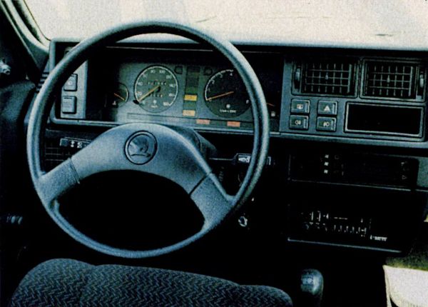 Mi van még odabent? A műszerfalon az, amit a Favoritnál is megszokhattunk, plusz egy kellemes változtatás: a hatalmas időmérő óra helyét a fordulatszámmérő vette át. Igaz, az utóbbi fontosságát a mindennapi autózásban sokan vitatják, de ha másra nem is használjuk, mint, mondjuk, az automatikus dúsítóberendezés működésének ellenőrzésére, már megérte az óracsere. (A próbaút idején külön figyeltem, visszaszabályoz-e a szívató, ha a kocsi motorja melegedni kezd. Nos, a jelenség a fordulatszámmérőn jól követhető: ha a hűtővíz hőmérséklete meghaladja a 40 Celsius-fokot, az alapjárati fordulatszám visszaesik 800/min. értékre.)