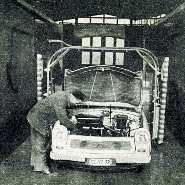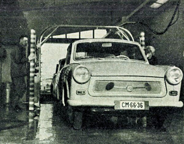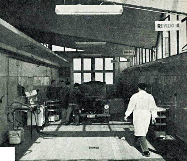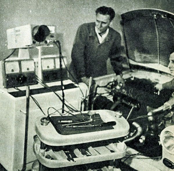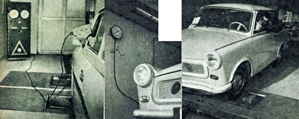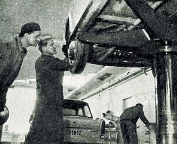 Magyarul: jól jár az a Trabant tulajdonos, akinek kocsiját most már itt gondozzák. A IX. kerületben levő Ecseri út 16. alatti telep ugyan nem éppen a város szívében fekszik, – és reméljük, nem lesz általános gyakorlat az új szervizállomások peremkerületi elhelyezése –, de azért, amit nyújtani tud, érdemes egyeseknek néhány plusz-kilométert áldozniuk. Ebben az üzemben szalagszerűen – az országban eddig még nem alkalmazott ellenőrző-műszerek beiktatásával – végzik a revíziókat, vizsgálják a motorok működését, teljesítményét. Különleges készülékek segítségével állítják be a gyújtást, a porlasztót, görgőspadon ellenőrzik a fékberendezést. Amit lehet, azt mindjárt rendbe is hozzák a revíziós szalagon, az olyan kocsikkal pedig, amelyeken úgynevezett műhelymunkát is kell végezni, be lehet állni a 400 m2 alapterületű, szintén jól felszerelt javítócsarnokba.