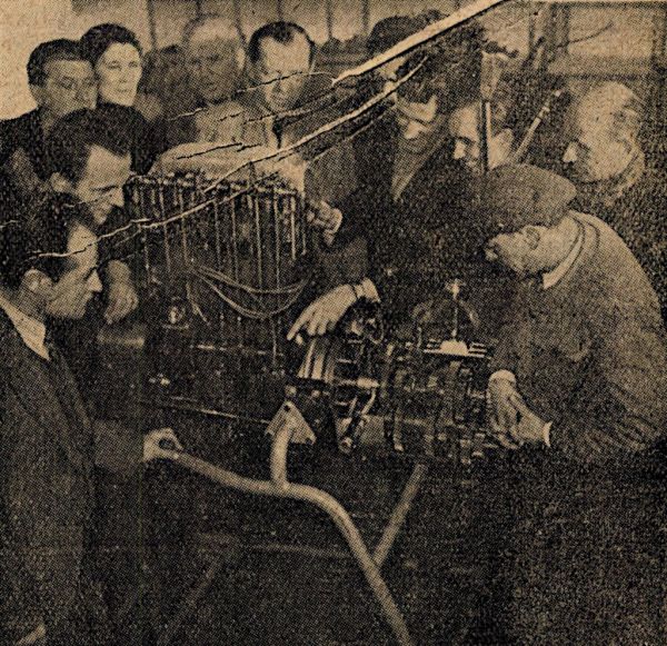 – Tíz különféle kivitelű komplett benzinmotorja van az Intézetnek – magyarázza Kántor György, miközben megtekintjük az alulvezérelt, felülvezérelt, a négy és nyolchengeres és a többi benzinmotorokat. Újból a fal melletti állványhoz megyünk és itt megtekintjük a különlegesen meghibásodott hajtókarokat, dugattyúkat, csapszegeket, stb.