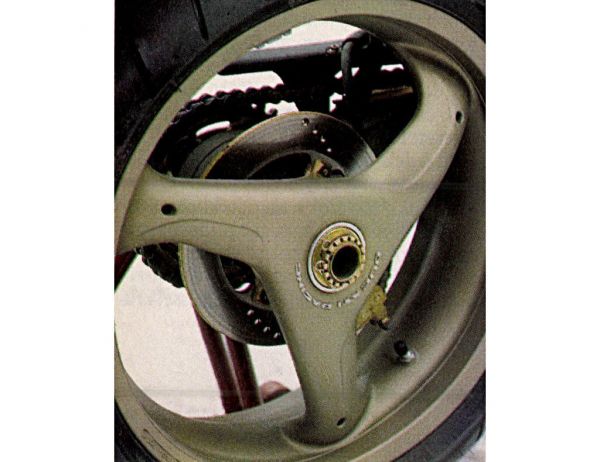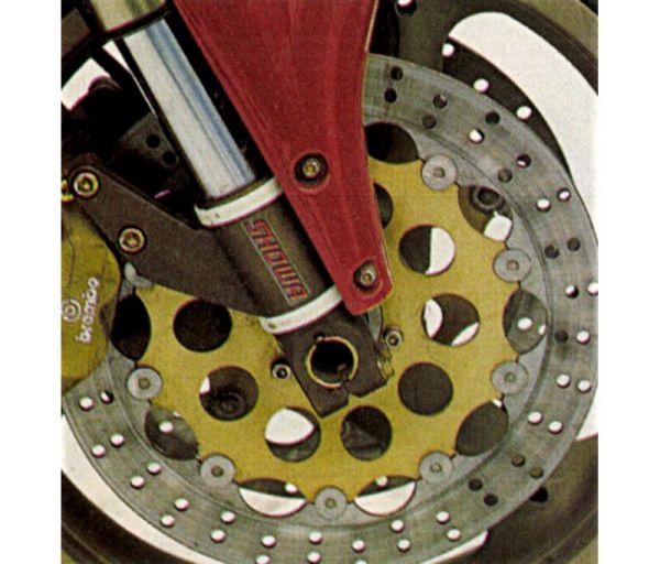 A hátsó rugóstag szintén Japánból, a Showától érkezett, és ahogyan azt illik, a csillapítás húzó-nyomó irányban is hangolható, és természetesen a rugó-előfeszítést is a vezető igényei szerint lehet beállítani. A rugóstag egyébként az ipari szobrászat egyik remekét, egy egybeöntött könnyűfém lengőkart kapcsol a vázhoz. A hátsó kereket a tengelyén egyetlen rugóbiztosítású koronás anya rögzíti, így a kerékcsere – ha szükséges – csupán másodpercekig tart. A fékrendszer – vérbeli olasz masinához illőpen – a Brembo műhelyből származik. Az első tárcsapár mindegyike 320 mm átmérőjű. A fékbetéteket oldalanként két-két dugattyú nyoma a tárcsához, ami sokkal biztonságosabb megoldás, mint az úszónyereg. Hátul szintén szembedugattyús a tárcsafék, az átmérője 220 mm.