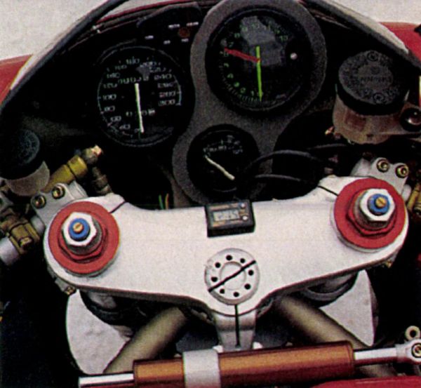 – Nekem legalábbis nagyon megfelel. A hosszában elhelyezett V-motor miatt sokkal keskenyebb, mint a keresztben elhelyezett soros négyhengeresek. Ezért jobban lehet térddel fogni, és jobban is dönthető. A másik, a kis CBR 7500-7600/min fordulatszámig nagyon harmatos. Afelett aztán egyszerre szakad fel belőle az erő. Ezt a fajta karakterisztikát én nem szeretem. A Ducati szinte az alapjárattól, kétezertől kegyetlenül húz.