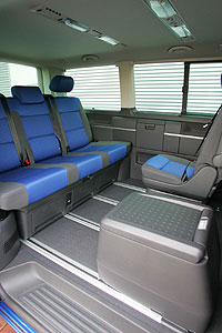 Új vonás a hátsó rész átalakíthatósága. Ezt a padlózatban kialakított sínrendszer teszi lehetővé. Ezzel a rendszerrel az egyes ülések, a fekvőhellyé átalakítható üléspad, és a Comfort/Highline kivitel asztala is a hátsó rész tetszőleges helyén rögzíthető. A Trendline egyes ülése, valamint a Comfort/Highline második üléssorának két egyes ülése elforgatható. A hátsó üléspaddal együtt képezik a fekvő felületet a Multivanban. Kívánságra meghosszabbítható ágy és a sötétítést szolgáló „jó éjszakát” csomag is rendelhető. Az összes üléshelyen a hárompontos biztonsági övet az üléshez rögzítették és így az ülés minden helyzetében optimális biztonságot ad. Az állítható magasságú és dőlésszögű fejtámlák is hozzájárulnak a biztonság megteremtéséhez.