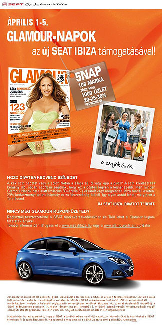 A Glamour Napok hete alatt megrendelt bármely SEAT Ibiza modellnél, felszereltségtől függetlenül 20 százalék kedvezményt ad a SEAT bármely extra felszereltség árából. De nem csak ezért érdemes ellátogatni március 30 – április 5. között a 28 SEAT márkakereskedés egyikébe. Aki egyelőre még csak ismerkedik az új SEAT Ibizával, annak is tartogat meglepetést a márka, hiszen minden tesztvezetéshez egy ajándék Glamour Napok kuponfüzet is jár, mellyel a tesztvezetők április 1-5. között 108 márka termékeiből, több, mint 1000 üzletben 20 – 25 – 30 százalék kedvezménnyel vásárolhatnak. A kuponfüzet egyébként csak az áprilisi Glamour magazin megvásárlásával együtt érhető el, így ez egyedi lehetőség az Ibiza iránt érdeklődőknek.