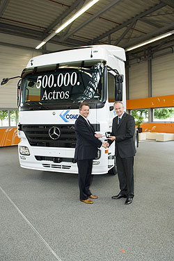 Az 1841 LS típusú nyerges vontatót Hubertus Troska, a Mercedes-Benz tehergépkocsi üzletágának az európai valamint latin-amerikai régióért felelős vezetője és Ulrich Bastert, az üzletág értékesítési és marketing vezetője adta át Hervé Street-nek, a francia Star’s Service speditőrcég elnökének. A Mercedes-Benz Actros Európa legnagyobb darabszámban előállított nehéz tehergépkocsija. Az Actros tizenegy évvel ezelőtt mutatkozott be a Mercedes-Benz haszonjármű-kínálatának csúcsmodelljeként. Második generációja 2003. óta kapható. Magyarországon 2000 és 2007. júniusa között 2532 darab Mercedes-Benz Actros értékesítésére került sor.