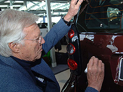 tridion biztonsági cellához. Az üléskárpit és az ajtótükrök, valamint a kormánykerék borítása bordó bőrből készült. A háttámlákon elhelyezett kicsi szövetrózsa ugyancsak sikerülten tükrözi a Sissi-stílusvonalat. Még a kocsi lábszőnyegei is bordó tűvelúrból készültek. A kis jármű valódi unikum.