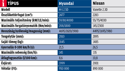 Az ilyen, kettős szerepben teljesítő autóknál rendkívül fontos a vételár. 1999-es Hyundai H-1-est már 600 ezer forinttól találni, persze a jobban felszerelt, két üléssorú 2004-es darabok már 2,5 milliót is kóstálhatnak. Nagyritkán akadnak szinte újszerű, egy-két éves, 9-12 férőhelyes példányok, melyek még mindig valamivel négymillió alatt keresik új gazdájukat. Leharcolt 1996-os Nissan Vanette „munkásautót” már 350 000 forintért kapni! A sor másik végén a megkímélt, családi feladatokat ellátó 2002-esek állnak, melyek ára nem haladja meg a 2,5 milliót. Hyundaiból körülbelül 35-40 darabot, míg Nissanból 50-55-öt kínálnak eladásra különféle csatornákon.