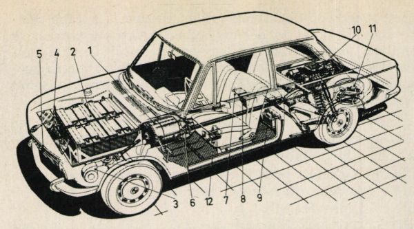 1. Bosch villanymotor 43 lóerőnek megfelelő teljesítménnyel – 2. Nagy teljesítményű 12 voltos Varta akkumulátorok – 3. Hűtőventillátor a villanymotorhoz – 4. Az akkumulátor-tér szellőzője – 5. Az akkumulátor-töltő csatlakozója – 6. Áttételmódosító 2:1 aránnyal – 7. Biztosítók – 8. Főkapcsoló – 9. Normál, 12 voltos akkumulátor – 10. Tirisztoros vezérlőegység – 11. Fojtótekercs – 12. A menet- és fékpedál lineáris szabályozója