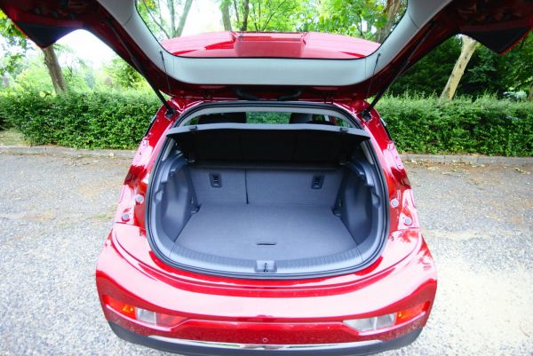 Az alá beépített akkucsomag nem vesz el a helyből, használható méretű a dupla fenekű csomagtartó is, amely az ülések ledöntése után teljesen sík padlójú is lehet. Belső hangulata is amerikaias, mégsem idegen az Opel stílusától. Berendezése praktikus, sok a nyitott és fedeles rekesz, még egy női táska tárolására alkalmas helyet is kialakítottak a váltókonzol mögött. Anyaghasználata a márkán belül átlagos, a világos, mintás műanyag betét a BMW i3-as újrahasznosított anyagaira rímel, az irányváltó is hasonló, joystick rendszerű. L állásban az i3-asból és a hibrid Toyotákból is ismert módon az üzemi fék energiájának megfelelő a motorfék hatásfoka, így az esetek többségében rá sem kell lépnünk a bal oldali pedálra. Ez kissé szokatlan, de úgy tehermentesíti a fékrendszert, hogy közben az akkumulátort is segít visszatölteni.