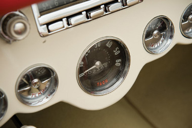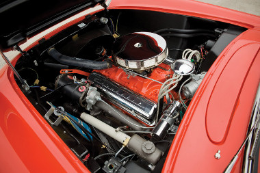 Eleinte még soros hathengeres motorral adták a Corvette-et, mivel a műanyag karosszéria miatt elég drága volt az autó, és nem akarták tovább növelni az árat az épp akkor bemutatkozó, nagyon korszerű small-block V8-assal. Szerencsére az első évet követően már nem kicsinyeskedtek ennyire, ennek a példánynak a motorházteteje alatt már a 265 köbinches, 195 lóerős teljesítményű nyolchengeres dolgozik. Ez egyébként már óriási előrelépés volt a korai példányok alig 145 lóerős teljesítményéhez képest – itt most természetesen SAE lóerőkről beszélünk, amelyet minden segédberendezés nélkül mérnek, a valóságos teljesítmény ennél húsz-harminc százalékkal lehet alacsonyabb.