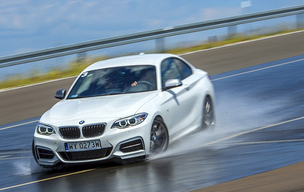 Ebben a szekcióban értelemszerűen a kisebb tömegű modellek voltak előnyben, de azok közül is kiemelkedő volt az összkerékhajtású M235i: elképesztő, hogy gázon fordulva milyen különbség van a 4×4-es és a „hátsókerekes” modellek között! A kifutópályán kialakított nagy sebességű pályaszakaszon is mókás volt terelgetni a 326 lóerős kupét, de az utána következő M4-es egészen más dimenzióba repített. Persze sokkal erősebb (431 lóerő) és vadabb már csak a motorja miatt is, villámgyors duplakuplungos váltó cserélgeti az áttételeket, a futómű betonkeményre állítható, a kormányzás pedig túlzás nélkül tökéletes – ebben az autóban testesül meg mindaz, amiért egykoron a BMW M részlegét életre hívták. Őrülten stabilan fordul nagy tempónál az M4-es, de az sem semmi, hogy még túlforgó kerekeknél is viszonylag könnyű kordában tartani, mivel az M Dynamic Mode bizonyos mértékű kipörgést engedélyez anélkül, hogy durva farkitöréstől kellene tartani. Az M4-es négyajtós megfelelőjével, az M3-assal viszont egyenesen az volt a feladat, hogy egy körülbelül 10 méteres sugarú, fellocsolt kör mentén drifteljünk. Elég egy határozott gázadás és máris keresztben áll az autó, de hiába „adagolható” szépen a nyomaték, az 550 Nm azért tud meglepetéseket okozni, konkrétan, egy pillanat alatt 360 fokos fordulatot tehetünk. Ugyanebben a szekcióban volt egy M135i is. Ez is tipikus „mókaautó”, hiszen ebben is 326 lovas hathengeres dolgozik, akárcsak a 235i-ben, csak itt a kézi váltó és a hátsókerékhajtás miatt még inkább vegytiszta az élmény. Még akkor is, ha sperrdiffi hiányában nehezebb táncba vinni, mint az M3-ast, viszont ha egyszer elkezd csúszni, a tapadáshatáron egyensúlyozva sem nagy ördöngösség vele menni.