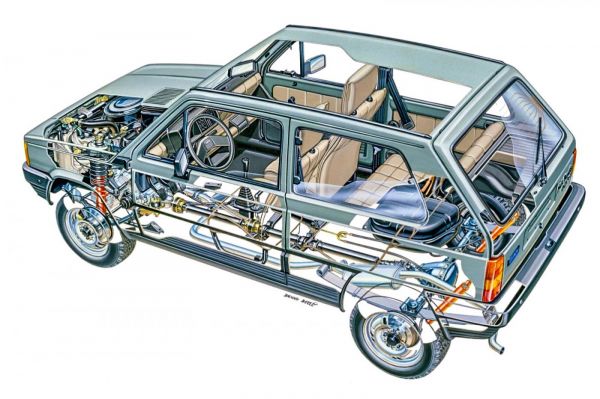 Szögletes lemezei alatt a Panda egy kifejezetten átgondolt munka eredménye volt. Giugiaro úgy tekintett rá, mintha egy katonai helikopteren dolgozott volna, ahol a tömeg csökkentése, a célszerűség és az előre kijelölt felhasználási terület meghatározó, szemben olyan szempontokkal, mint a látvány és a kényelem. Ahhoz, hogy olcsó lehessen, magát a gyártási folyamatot is optimalizálni kellett. A lehető legegyszerűbb karosszériaelemek mellett sík üvegeket kapott, még az ajtózsanérokat sem tüntették el. Olyan felesleges alkatrészeket, mint a nagy és nehéz műszerfal, vagy az epedás ülések, már a korai fázisban elvetettek.