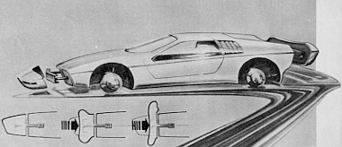 Érdekes megállapítás, amelyről tudomásunk szerint angol források eddig még nem tettek említést. Ettől függetlenül a tetővonalból nyíló ajtók alatt is sok különlegesség húzódik meg. A Turbo utasfülkéjében például egy fénysugár jelzi a mindenkori sebességet, a 280 km/órára kalibrált skálán. Az ülések mögött keresztben elhelyezett négyhengeres, vízhűtéses 2 literes motorral ugyan még csak 240 a kocsi végsebessége, de részben a kipufogógázos Turbo-kompresszor és még több más fejleszthető berendezés segítségével ez is fokozható. A bal oldali ajtóoszlop közelében levő külön műszertábla a fékbetétek kopását, a fékfolyadék mennyiségét, nyomását és más üzembiztonsági pontokat képes jelezni. Szem előtt levő magasságban pedig egy külön műszer még a kanyarvételnél kritikus gyorsulásra is figyelmezteti a vezetőt.