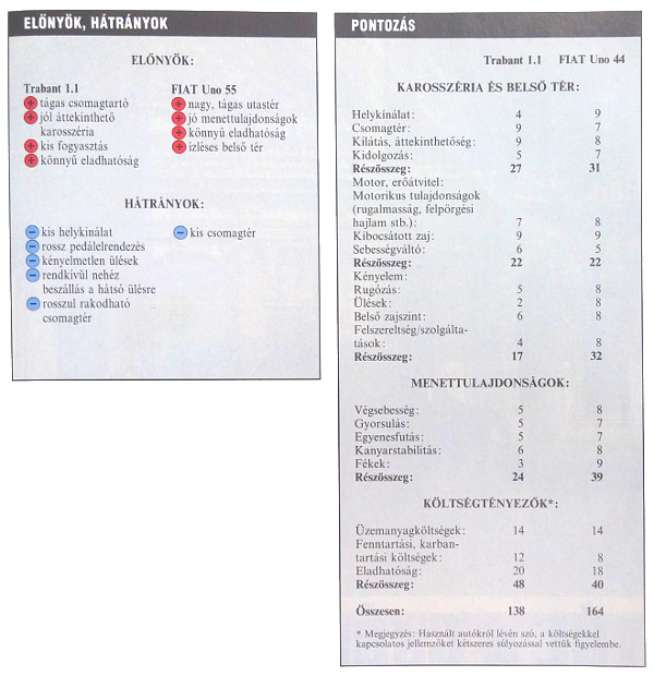 A teszt és a vizsgálatok végeztével arra a megállapításra jutottunk, hogy az Uno egy kényelmesebb, jobban használható autó, de fenntartása – az előre látható hibák kijavítása – nagyobb anyagi áldozatot követel, mint a Trabanté. Érdekes, és talán kissé meglepő is volt látni viszony, hogy fiatal kora ellenére a Trabi milyen sok alkatrészt igényel. Mivel ezek közül több már csak nyugati árszínvonalon érhető el, hosszabb távon nem biztos, hogy megéri a Trabant mellett dönteni.