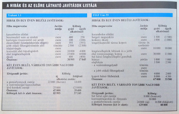 Azért, hogy mégis többet tudjunk a két autóról, mindkettőt elvittük egy-egy márkaszervizbe. A Trabanttal a magyar ralibajnokságban 601-essel versenyző Szabó György műhelyébe mentünk el, aki alapos látleletet vett az 1.1-esről, és felsorolta a leggyakrabban előforduló hibákat is. A tesztpéldány ezek közül többön már korábban (vízszivattyú-, hűtőtörés) átesett, amire a javítás nyomai utaltak. Volt azonban olyan hiba is, amit ez a vizsgálat derített ki. Ilyen volt például a gyújtáselosztófedél középelektródájának elégése, vagy a vezérműszíjjal kapcsolatban lévő szíjkerekek fáradásos (!) kopása. Ez utóbbi azért nagy érvégés, mert a teljes javítás szíjcserével együtt 25 ezer forintba kerül! Szintén tipikus magának a gyújtáselosztónak a meghibásodása, ami a tesztautón még rendben volt. Csupán felsorolásszerűen néhány további jellemző gond: hátsó fékbetétek gyakori (20 ezer kilométerenkénti) elkopása, első lengéscsillapítók gyakori (50 ezer kilométerenkénti) hatástalanná válása, a gumicsövek idő előtti tönkremenetele. Az ezek után már csak apróság, hogy a kormányoszlopot vezető műanyag persely kiesése miatt a kormány lötyögős és nehezebben forgatható.
