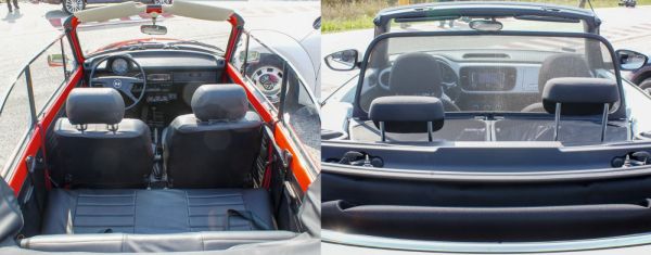 A modern technika előnye a hatásos fűtés, a hagyományos mellett az ülésfűtés is aranyat ér, aminek köszönhetően úgy 5 °C-ig különösebb probléma nélkül lehet élvezni a kabriózást – persze szigorúan felhúzott ablakokkal és felállított szélfogóval. Az öreg autóban az a gond, hogy a léghűtés miatt a meleg csak akkor jön előre, ha tényleg hajtják az autót, lassan haladáskor bizony elég hamar didergős lesz a hangulat. A farmotoros Bogár kabrió az osnabrücki Karmann gyárban készült, és ma már gyűjtők féltve őrzött kincse, az új Beetle Mexikóban gördült le a sorról, és jó úton van afelé, hogy klasszikus legyen. A folytatás, ha minden jól megy, a következő évtizedben várható, akkumulátoros-elektromos hajtással, de az már egy másik történet…