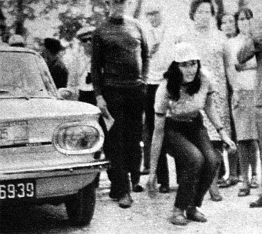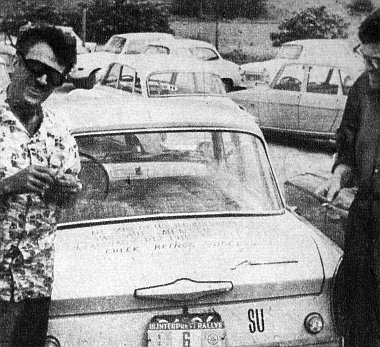 A nagykategória győztese, a szovjet Kotjelevszkij és utasa a 412-es Moszkviccsal, amelynek csomagtartóján 4 nyelven is bölcs közlekedési tanácsok voltak olvashatók