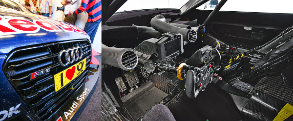 Karbon-repülőgépacél biztonsági cella védi a sofőrt és a 120 literes benzintankot Az utcai RS5-öshöz képest sokkal hátrébb, mindössze 10 centivel az aszfalt felett ül a pilóta, csőlátása van, az aszfaltot csak nagyjából 25 méteres távolságban látja. Normál esetben a 120 literes üzemanyagtartály (szivacsbetét akadályozza a lötykölődést) utazik mellette, mi Matthias Ekström tavalyi, versenytaxinak átépített autóját nézhettük-tapogathattuk meg – ennek sem volt szabad befényképezni a belsejébe! Egyébként utcai, a német Aral Ultimate 101 oktános benzinjét égetik el az autók, amelyet a paddockban lévő kamionból vételeznek 2 euró/liter áron.