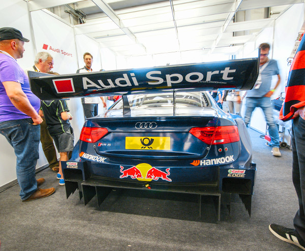 Márkajelzések és szellőzőnyílások – ennyi széria alkatrész van egy DTM versenyautóban. Fotó: Lővei Gergely és Audi A biztonsági cellára szabják a karosszériát, s az Audi büszke arra, hogy nekik kellett a legkevesebbet módosítani az utcai megjelenésen. A Mercedes még elmegy, de a BMW-re rá sem lehet ismerni az Abt csapat szakembere szerint. A fényszóró például szélesebb és laposabb az utcainál, tömege az eredeti 20%-a – egyedül a nappali menetfény világít a reklámértéke miatt, ha a pilóta elfelejti felkapcsolni, a csapat pénzbüntetéssel sújtja –, a hűtőrács formája is egyedi. Mindössze hat darab olyan alkatrész van, amely változtatások nélkül került át a versenyautóba: a négy karika és az RS 5-ös jelvény az autó elején-hátulján, illetve a sofőr légkiömlőjének rácsai, amelyek egy TT-ből származnak, és azért használják, hogy a pilóta legalább kis mértékben tudja irányítani a légsugarat. Mivel a karosszéria zárt, és közvetlenül a sofőr előtt dolgozik a benzinmotor, borzasztó a hőség az utastérben, a mérések szerint akár 80 fok is lehet! Elengedhetetlen az átlag feletti állóképesség, például Matthias Ekström úgy tartja magát formában a téli szünet idején, hogy teljes versenyfelszerelésben egy órán keresztül kerékpározik a szaunájában – nem a helyiség olyan nagy, hanem szobakerékpárt használ…