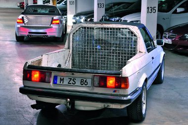 Ahogy belépünk a hűvös, sötét garázsba, katonásan, egymás mellé állítva fogadnak minket az M-es BMW-k, az első, 1979-es M1-estől kezdve egészen az M6-os Cabrióig. Aztán hirtelen megpillantunk olyan járműveket, amelyek egyszerűen ismeretlenek. Elsőként az E30-as M3-as pick-up változatával nézünk farkasszemet, amely itt-ott már rozsdásodik, de működőképes! Ez a modell tulajdonképpen a nürburgringi tesztelésekhez készült kisegítő járműnek, így piacra dobásra nem is gondolt a BMW, de akkor is meghökkentő.