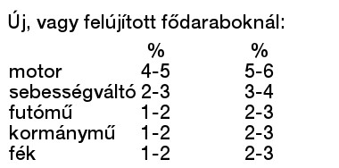 Lada valamennyi típusa, továbbá a 2000 cm3 feletti nyugati gépkocsik: 5000 km-enként 1,5 %