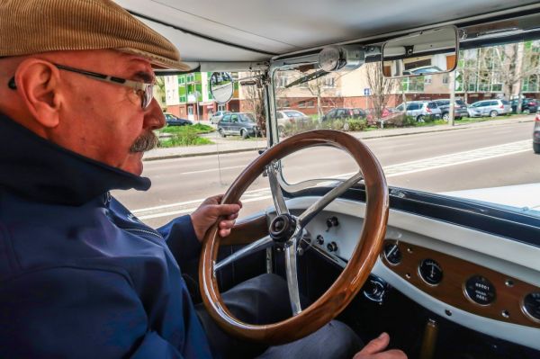 Próbaútra mentünk az idős gépezettel. Gombnyomásra azonnal indul a motor, elámulok, hogy milyen fürgén robog Ferenc az egri utcákon. Tempósan veszi a kanyarokat, zöld lámpára úgy gyorsít, mint a többiek, tartja a forgalom ritmusát. Bámulatos – ez egy gyakorlatilag használható kocsi! Benzinkútra térünk be, megtölteni a motorházban, hátul, felül elhelyezett tartályt. Minden úgy megy, mintha most hoztunk volna ki egy új autót a kereskedő szalonjából. Mikor a kanapészerű hátsó ülésbe telepszem át, oldalablakok híján erősen érzem a hűvös menetszelet, jól esik magamra teríteni az odakészített takarót. Ugyanakkor csodás, hogy teljesen kinyújthatom a lábam – melyik modern típusban tehetném meg ezt? A vezetőülésbe beszállni nem egyszerű művelet, mert noha Ferenc 10 centivel hátrébb tolta az első ülést, így is nehéz befűzni a lábaimat. Sem az ülés, sem a kormány nem állítható, ekkora a hely, és kész. A pedálok már a ma megszokott rendben állnak (akkoriban még előfordult középre helyezett gázpedál is), de a váltó kapcsolási sémája fordított: tőlem távolabb, hátul van az egyes, és a combomnál a két felső fokozat. Az elsőben csak megindítani kell a kocsit, majd hamar felkapcsolni direktbe, és rábízni magunkat a motor nyomatékrugalmasságára. Persze egyik fokozat sem szinkronizált, felkapcsolás dupla kuplungozással, köztük kivárással, visszakapcsoláskor pedig közbenső gázfröccsöt kell adni. Még jó, hogy 1965-ben szereztem teherautó-jogosítványt, hasonlóan működő Csepelen, és azóta is vezettem néhány veteránt. Menet közben észrevehető, hogy a sebességváltó fogaskerekei az első két fokozatban egyenes fogazásúak, mert ilyenkor halk vinnyogó hang festi alá a motorbúgást, és csak harmadikban csendes járású, mert az már direkt fokozat.