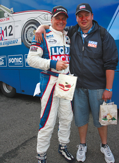 Közben lehetett a csapattal izgulni és élvezni a boxutcából a közönség tombolását, kiknek a lelkesedése előtt a német csapat is fejet hajtott: ritka az ilyen jó közönség! S ritka az olyan jó vendég, mint Krisztián, aki ajándékot is hozott a versenyzőknek, mégpedig két szép nagy Miska- kancsó formájában! A jól eltalált gesztussal meg is lepte őket, a dobogóról éppen a lakóautójához érkező Franz Engstler a pezsgőszagú győztes sapkáját Krisztián kezébe nyomta. De meg is érdemelték, mert a jó futam mellett jó ötlet volt civilt bevonni a csapatmunkába, aki így végre nem a lelátóról, hanem belülről is végigélhette a versenynapot, és igazán élvezte. Elhihetik, Krisztián mondta!