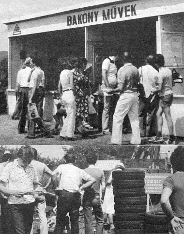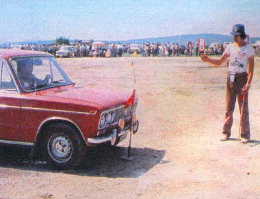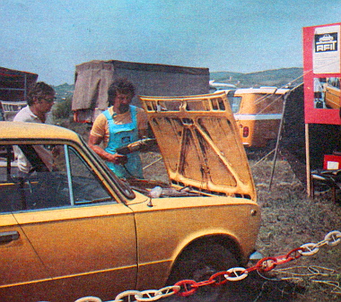 Minden versenyen izgalmasak a rajt pillanatai A „ring”, azaz az ügyességi pálya szalagokkal körbekerítve, s aztán ezen a kerítésen túl újabb „határ”: Ladák végtelennek tűnő sorakozója. Megvan, persze, hogy megvan most is a „sátrak utcája”, ahol ingyenes gyújtásállításért sorakoznak az autósok, itt a Bakony Művek árusítással egybekötött bemutatója, de természetes, hogy valamilyen szolgáltatással, vagy bemutatóval képviselteti magát a Lada-kooperációban résztvevő valamennyi vállalat, s ugyancsak jelen vannak az értékesítésben érdekeltek, a Merkur, az Autóker és az Afit is. Sok főszereplője van ennek a találkozónak. Hiszen igazi „címszerepet” kaptak a Ladák, s olyannyira, hogy az egyetlen „idegen” autó egy ötszázas Fiat, szinte szégyenlősen bújik egy sóderdomb mögé: de hát főszereplő itt minden résztvevő is.