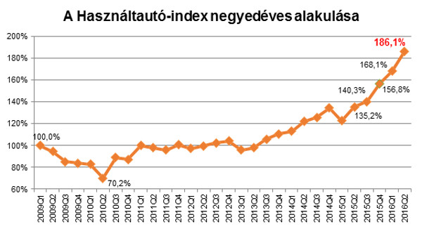 Az autók átlagára éves összehasonlításban szintén növekvő trendet mutat, jelenlegi szintje az első negyedévhez hasonlóan 1,8 millió forint közelében mozog. Fentiek hatására új rekordot állított be a Használtautó-index: az elkelt használt személygépkocsik összértékének változását jelző mutatószám elérte a 186,1 százalékos értéket.