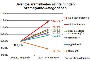 „2014-ben a Használtautó-index végre meggyőző mértékben maga mögött hagyta azt a sávot, amelyből a válság kezdete óta évekig nem tudott kitörni. Mostanra azonban már több mint harmadával nagyobb összértékben cserélnek gazdát a használt autók a hazai piacon, mint 2009 elején – mutat rá Fodor László, a Használtautó.hu marketingvezetője. – A mennyiségi növekedést az újautó-eladások és a használtautó-import kedvező alakulása segítette ebben az időszakban. Az áraknak a szinte nem is létező inflációt jóval meghaladó növekedése pedig elsősorban a romló forintárfolyamnak, illetve a 2014 elejétől a használtautó-behozatalra is kiterjesztett vagyonszerzési illetéknek tulajdonítható.”