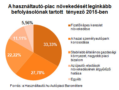 A növekedést elősegítő okok között a legtöbben az elérhetőbbé váló finanszírozási lehetőségeket (31%), a vásárlók fizetőképességének javulását (25%), illetve általában a stabilabb gazdasági környezet miatt erősödő optimizmust (25%) tették az első helyre. Az okok között ugyanakkor a legtöbben (68%) a hazai személyautópark idősödését említették meg a pozitív folyamatok kényszerű katalizátoraként (mint ismeretes, a hazai személyautó-állomány átlagéletkora már tavaly átlépte a 13 évet).