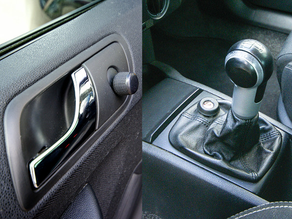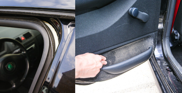 A fémkilincs még bírja, a műanyag váltógomb már megkopott A használatból eredő apróbb makulákon kívül annyi a hiba a külsőn, hogy az egyik lökhárító elkezdte levetni magáról a festéket (10 éves kor), és mindkét hátsó ajtónál beázik a karosszéria. Ezt már évek óta produkálja, a tömítések szemre rendben vannak, ellenben az ajtókárpit alsó, a zsebnél lévő részén már egész szép kis biotóp alakult ki annak köszönhetően, hogy állandóan van némi nedvesség ott. Időnként letörlik, de már beletörődtek… Egyébként az első ajtó felső sarkánál látszik, hogy összementek a gumitömítések, és a sarkoknál már elváltak a karosszéria élétől; a hátsó ajtónál nincs ilyen látható probléma.