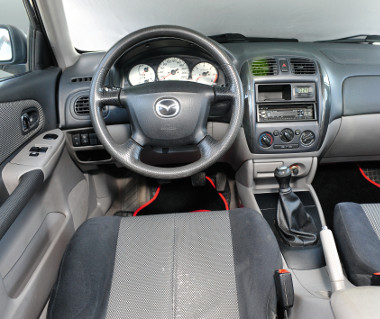 A 323F legnagyobb ütőkártyája a sportos formája és a zseniálisan variálható kabinja. A lapos kasztni, a mély üléspozíció bejön a fiataloknak, persze kicsit idősebben, fájós háttal már nem olyan könnyű kikecmeregni az autóból. A műszerfal fehér számlapos órái – magasabb felszereltségnél vagy a sportcsomagos változatoknál – feldobják a fülke hangulatát. A világos betétek, a tapintásra finom anyagú kárpitok és a kétszínű műszerfal jót tesznek a térérzetnek. Az első ülések kényelmesek, karunkat pedig középső könyöklőn pihentethetjük, mely alatt tágas rekesz található. A műszerfal átláthatósága japánosan letisztult, kevés és kellően nagy kapcsoló között könnyű kiigazodni.