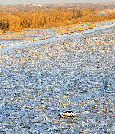 Jelen esetben Ordos városának közelében, a Sárga-folyón átívelő hídon közlekedők lettek figyelmesek egy autósra, aki meg akarta spórolni az átkelés költségét. Ehelyett kihasználva az időjárási körülményeket, a teljes szélességében befagyott folyam jegén kísérelte meg az áthaladást az itt mintegy 1 kilométer szélességű vízen.