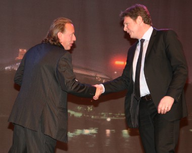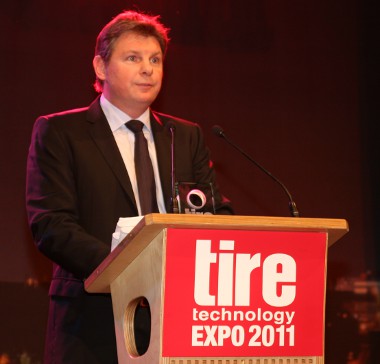 Tony Robinson, az Abroncs Technológia Expo alapítója, gratulál Stefan Fischer-nek (balról jobbra)