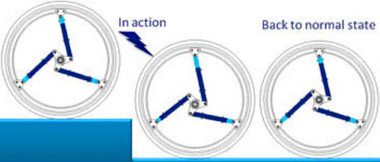Ennek lényege, hogy a kerékagy három teleszkóp segítségével csatlakozik a külső peremhez. Ütés esetén a kerékagy képes elmozdulni a központból, jelentősen csökkentve ezzel az erőhatást. A hagyományos felfüggesztésnél sokkal jobb hatásfokkal dolgozik a rendszer, amelynek alkalmazásával megspórolható például a kerekesszék vagy kerékpár rugózása, ami nem csak egyszerűbb, de könnyebb szerkezetet eredményez.