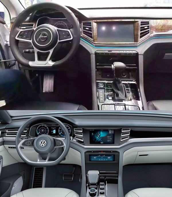A műszerfal se saját tervezés, azt is a Volkswagen tanulmányról vették át a kínaiak, még a középső kijelző melletti szellőzőnyílások hármas tagolása is változatlan, a kormánykeréken is épp csak annyi az eltérés, hogy a kályhaezüst betét nem megy körbe a karima alsó részén.