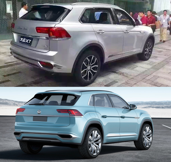 Nem erőltették meg az agyukat a kínai formatervezők, épp csak pár krómozott díszlécet toltak odébb, no és a hűtőrács mintázatát se merték átvenni, de egyébként szinte tökéletes mása a Domy X7-es a GTE CrossCoupe tanulmánynak. Azzal, hogy az oldalfalon nem a tanulmány kissé sarkos oldalfal-vonalát vették át, hanem egyszerűen kerek kerékjárati íveket használnak, csak tovább növelték a Volkswagenes hasonlóságot, hiszen így rögtön a Tiguannal is összekeverhető lett az autó.