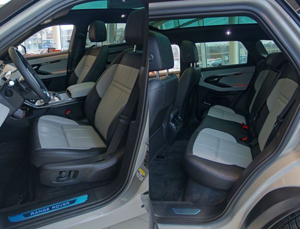 Ugyanaz a két modellstílusa, a süllyesztett kilincsek mellett a csíkszerű fényszórók is megszólalásig hasonlítanak. Szerencsére a szalonban egymás mellett állt a két autó, így könnyen észre lehet venni az eltéréseket: a Velar kicsit nyúlánkabb, magasabb a hűtőrácsa – három kontra hat sor díszcsík –, az R Dynamic csomaggal (a First Edition része) rendelkező Evoque prototípus pedig sportosabb, amiből a 21 colos felnik is kiveszik a részüket. A beltérnél már nehezebb különbséget találni, hiszen ugyanaz a kormánykerék, ugyanaz az érintőképernyővel kiváltott középkonzol van mindkét modellben.