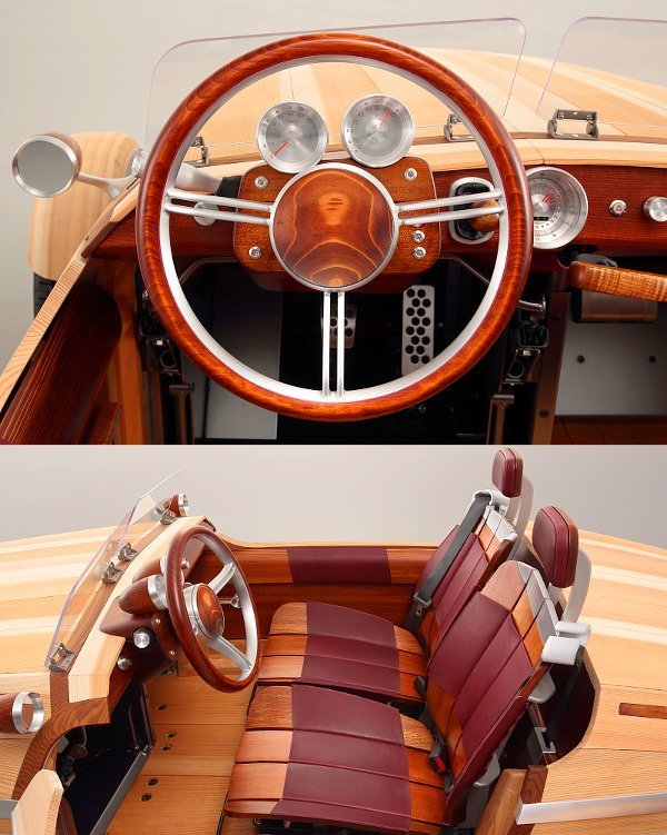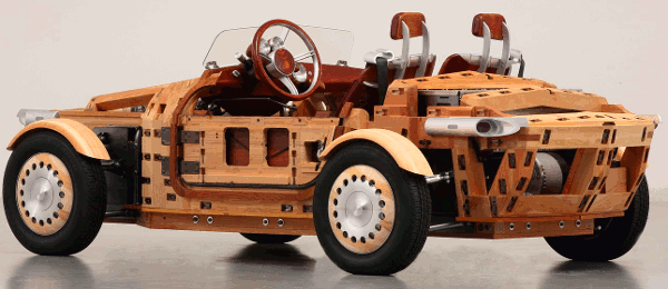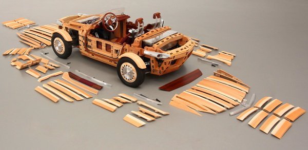 Összesen 86 darab kézzel megformált fa alkatrészből áll össze a karosszéria és az utastér burkolata, amely során az okurari elnevezésű technikát használták, azaz szögek nélkül csatlakoznak egymáshoz az egyes elemek, az ékkel szétfeszített csapok egyenként több réteget fognak össze, és oldható kötésről lévén szó javítást is lehetővé tesznek.