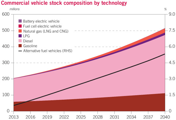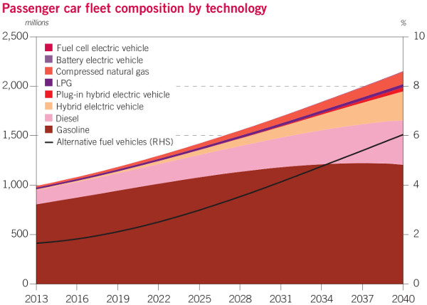 Az OPEC szervezet 2015-ös World Oil Outlook nevű előrejelzésében úgy számol, hogy még jó darabig nem kell aggódnia a tagoknak az alternatív hajtások térhódítása miatt, mert még 2040-ben is csak a személyautó 6, a teherautók 5,3 százaléka használ majd nem fosszilis eredetű üzemanyagot.