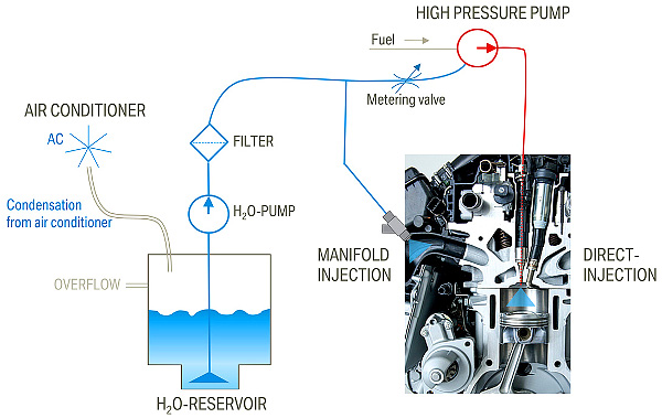 A BMW mérnökei a légkondicionáló kondenzvizét gyűjtik össze egy 5 literes tartályban, ahonnan aztán egy szűrőn keresztül a nagynyomású benzinpumpához vezetik azt, ahol összekeverik a benzinnel, és annak segítségével juttatják az égéstérbe pont a megfelelő mennyiségben, azaz magán a motoron-hengerfejen nem kell módosítani, csak az üzemanyag-ellátó rendszeren. Nagy sebességnél és fordulatnál akár 30 százalék lehet a víz aránya a benzinben.