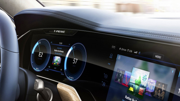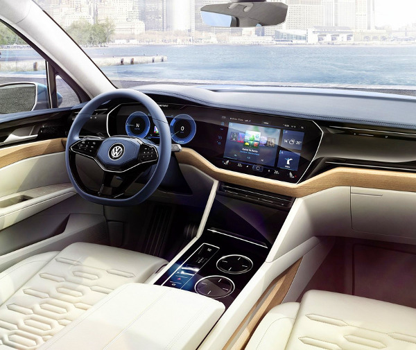 Igazán a belső térre büszkék a Volkswagennél, ahol egy hatalmas üveg alá került a középkonzoli érintőképernyő és a műszeregységet helyettesítő monitor, a műszerfal felső részét a kormánnyal együtt kék színű bőr borítja, nem spóroltak a zongoralakk-fekete betéttel, és még természetes fa betétnek is szorítottak helyet, az ülésekre vajszínű bőr került. Nem csak az érintésérzékeny felületekkel és hanggal lehet vezérelni az autót, de mozdulatokkal is