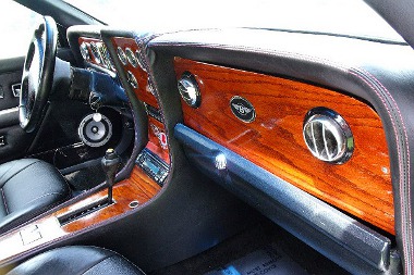 Az átépítés egyébként nem csak a karosszériára korlátozódik, a belső térben is a brit autó atmoszféráját próbálta megvalósítani Erl, aki valószínűleg egy régi szekrényt áldozott fel a fabetétek okán. A piros cérnával ékesített dupla varrású bőr sokat segít ugyan a helyzeten, de azért itt már első pillantásra világos, nem egy igazi Bentleyvel van dolgunk.